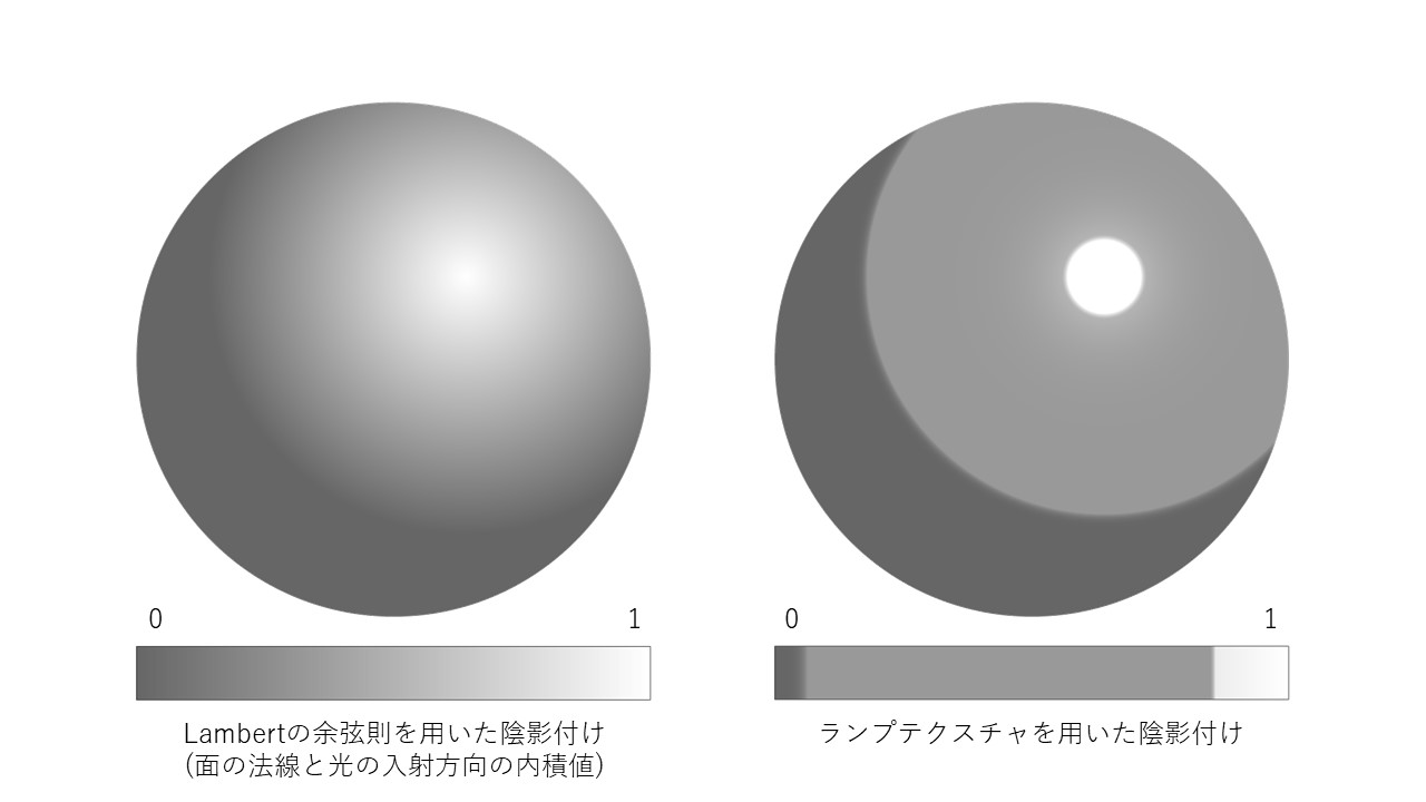 最初に拡散反射光(陰影)のマルチトーン表現について説明します。 前述したように、拡散反射光(陰影)のマルチトーン表現を行う際はランプテクスチャを用意して、陰影付けを行うのが一般的です。