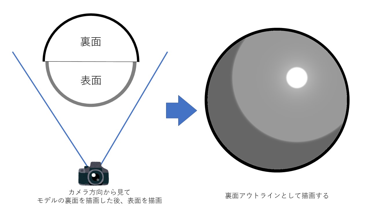 実装方法としては、「背面法」と「輪郭線の抽出」の二つがあります。 「背面法」とは対象のモデルについて頂点を法線方向に拡大して裏面を描画した後、通常の描画を上塗りすることでアウトラインを表現する手法になります。1