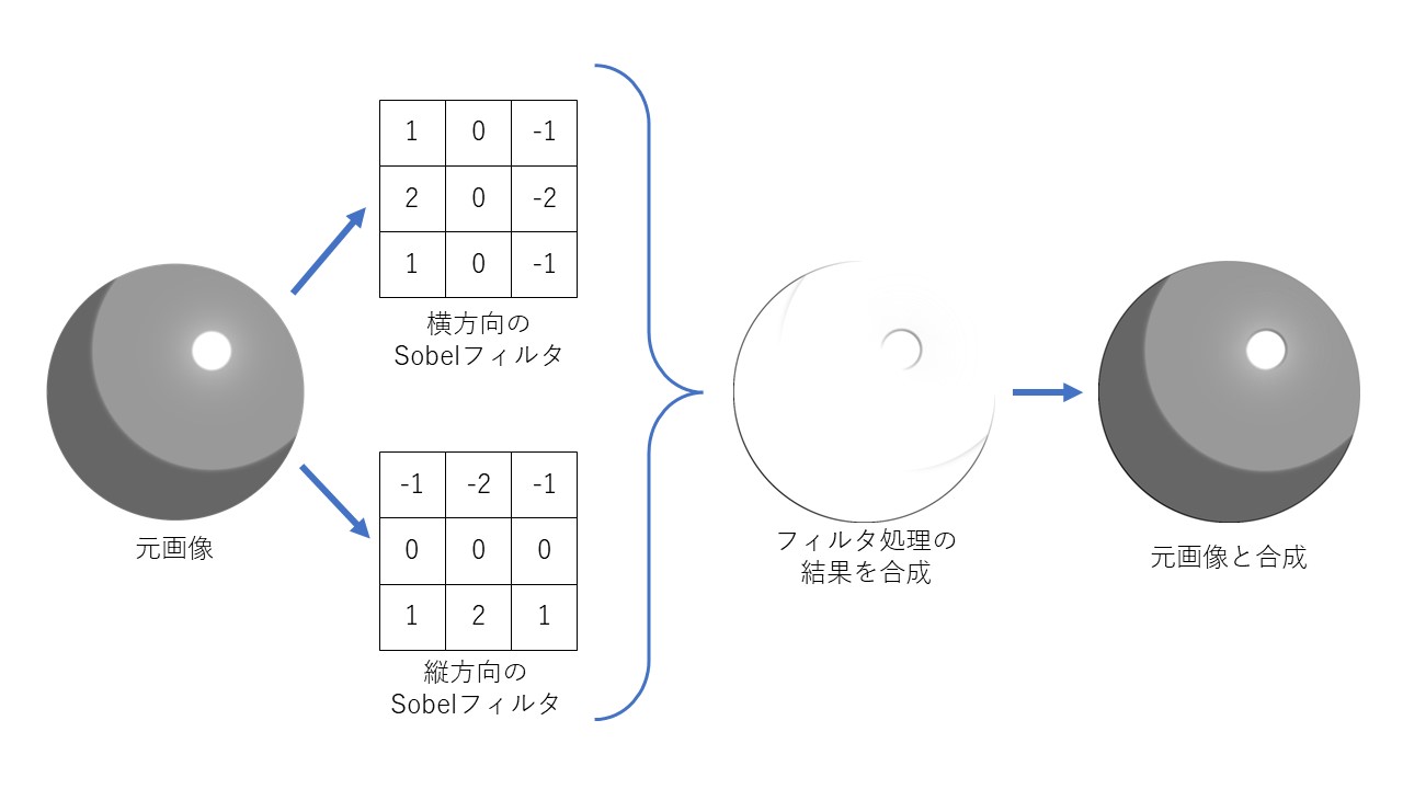 「輪郭線の抽出」とは、レンダリング途中で生成した深度情報等をもとにフィルタ処理をすることで輪郭線の抽出を行い、アウトラインを描画する手法になります。 下記図は、出力された画像に対してSobelフィルタを用いてアウトラインを描画する例になります。