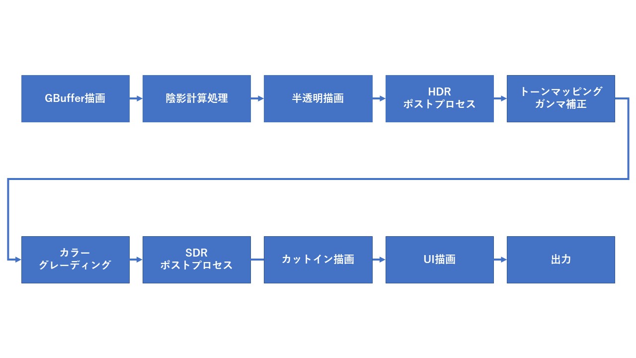 『NGS』では、不透明の描画について「ディファードレンダリング」を行い、半透明、カットイン画面で「フォワードレンダリング」を行うという実装になっています。 通常のレンダリングパスを図にしたものが下記になります。