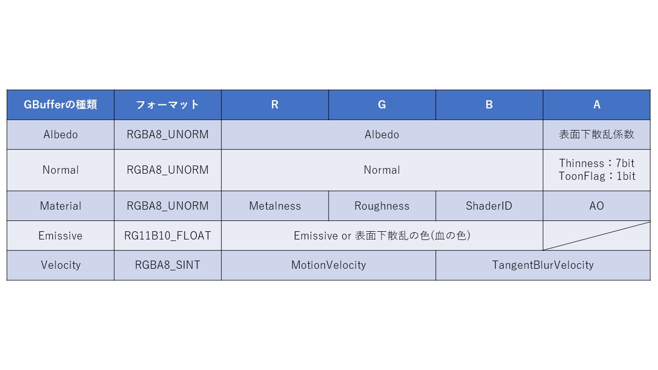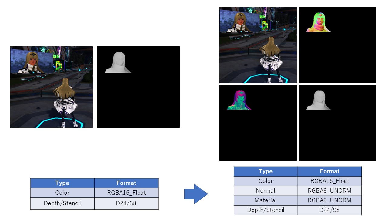 このカットイン画面は、全てフォワードレンダリングで描画しています。 既存の処理ではGBufferの情報を出力しない設計になっていたので、新しくGBufferの情報を一部追加で出力するように改良する必要がありました。 最終的には下記のように、フォワードレンダリングの結果だけでなく法線、マテリアル情報も出力するように変更しました。