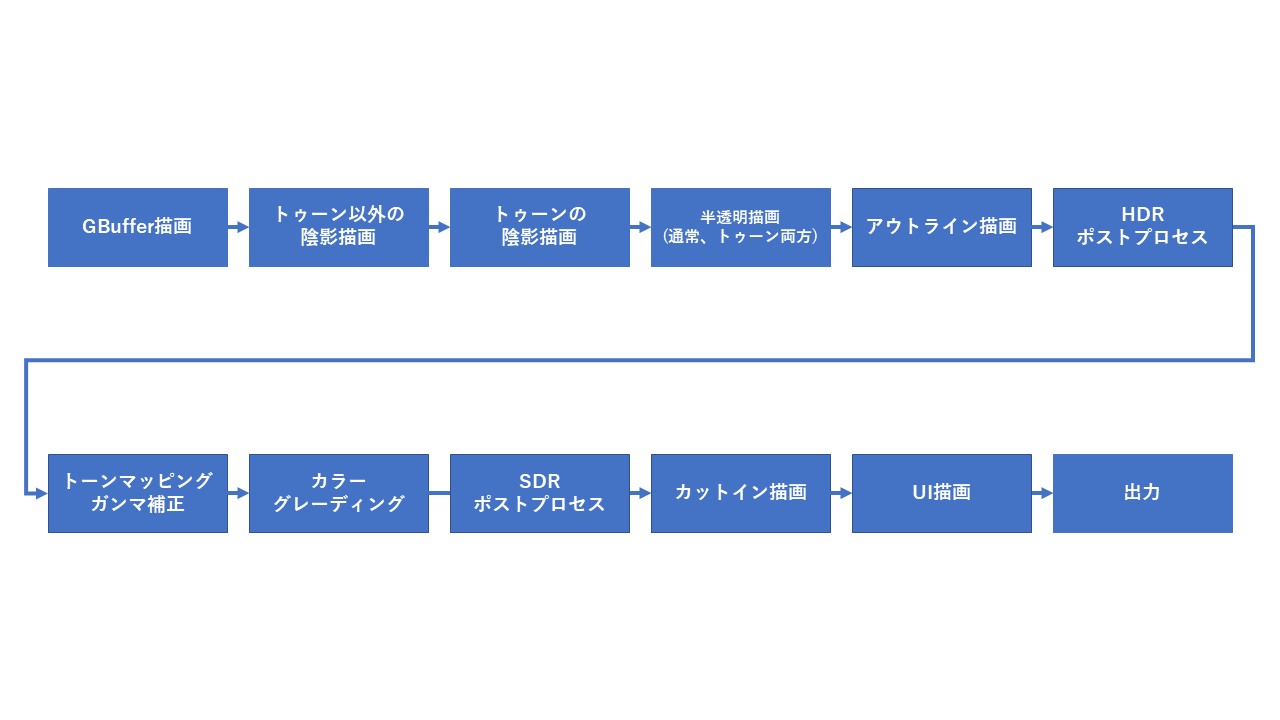 前述したように、モデルデータがトゥーン表示用のものではないので必要な情報を適宜GBuffer等から取得して、活用していくことで実装しました。 最終的なトゥーン表示におけるレンダリングパスが下記になります。