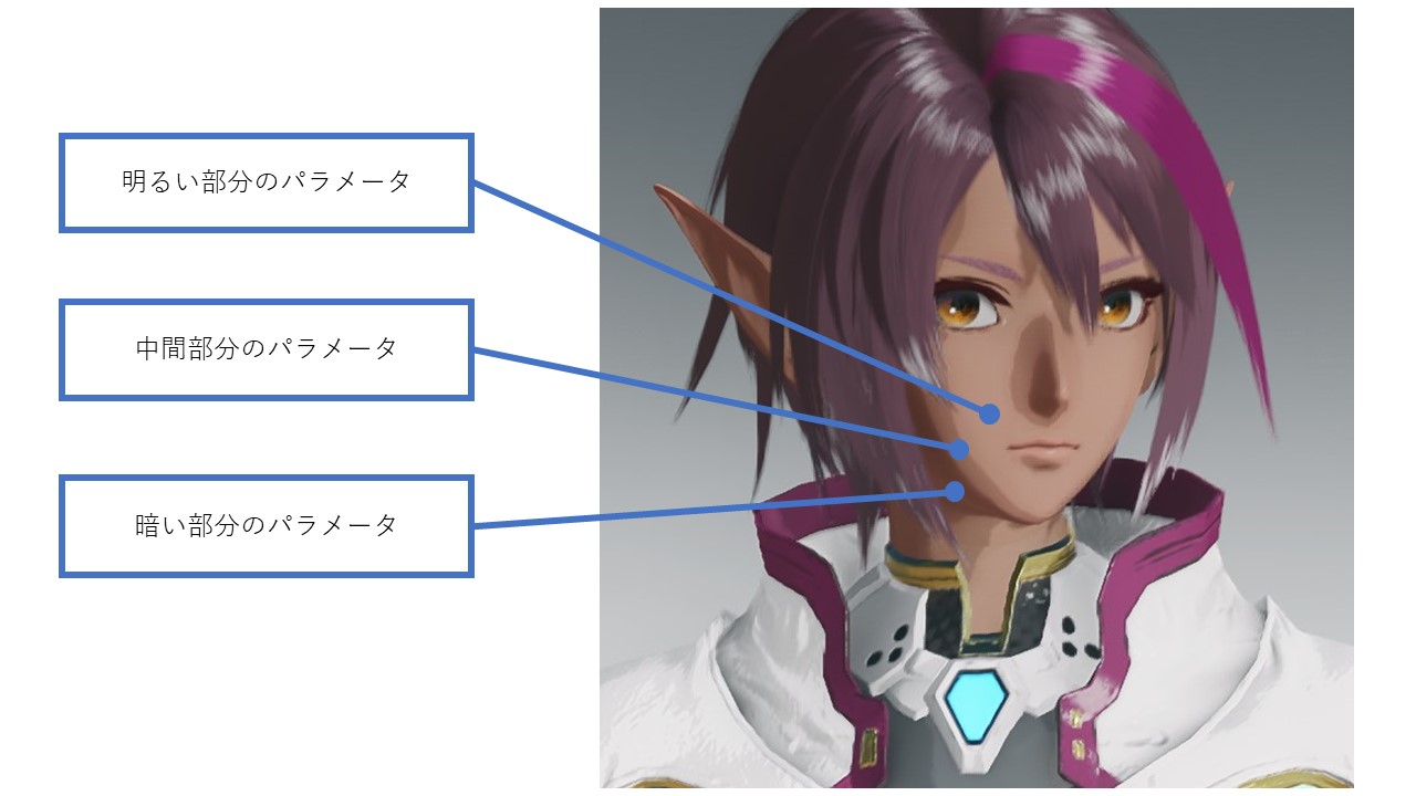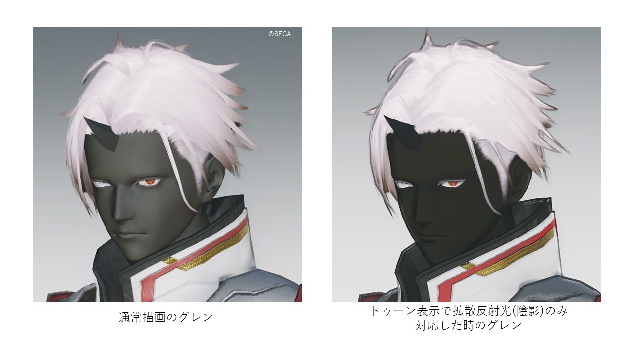 しかし、『NGS』ではゲーム中に登場するNPCの「グレン」のように、顔の色がほぼ黒色のキャラクターを作ることができます。 このようなキャラクターは前述した、「拡散反射光(陰影)のマルチトーン化」をしても陰影ができず、真っ黒になってしまうといったことが発生しました。
