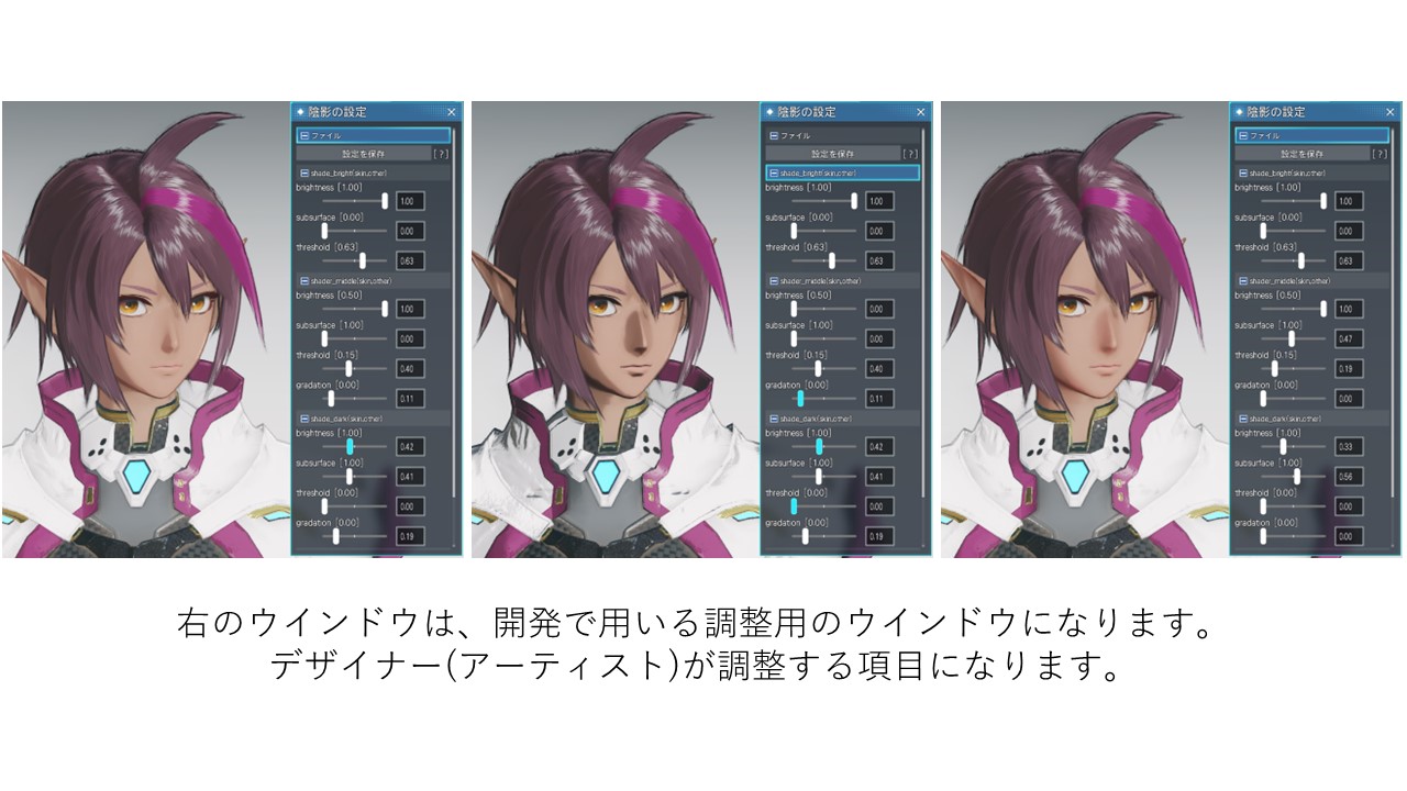 トゥーンレンダリングにおける陰影は、物理的な計算を解いて表現するフォトリアルな陰影とは違い、デザイナー(アーティスト)が指定、調整した色で陰影も表現されることが多いです。