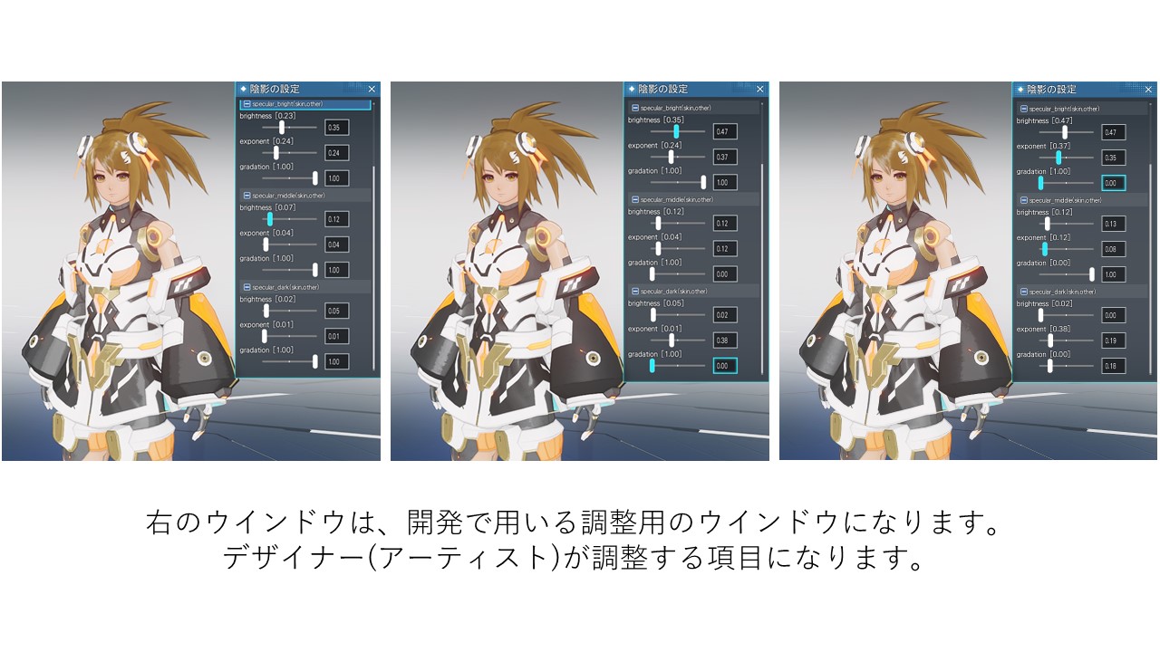 このため、『NGS』でも「陰影のマルチトーン化」と同様に「スぺキュラのマルチトーン化」を行うことで、黒色のキャラクターでもアニメ調のような陰影が見えるように実装を行いました。 下記が調整するパラメータになります。