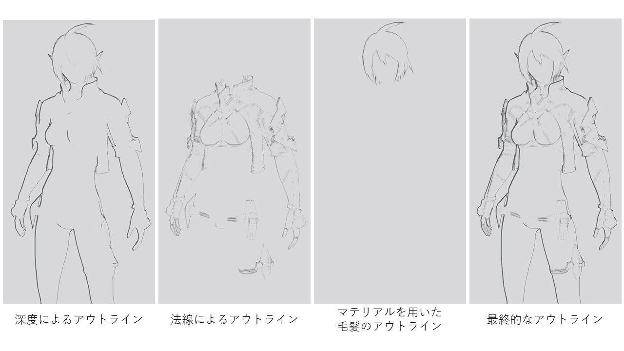 また、ShaderIDを用いて、「顔と毛髪以外は法線によるアウトラインを使用する」、「毛髪のみ、マテリアルによるアウトラインを使用する」と、カテゴリ毎に分けて使用することで、アウトラインを描画するようにしました。 下記が、それぞれの情報を用いて輪郭線の抽出を行った結果になります。
