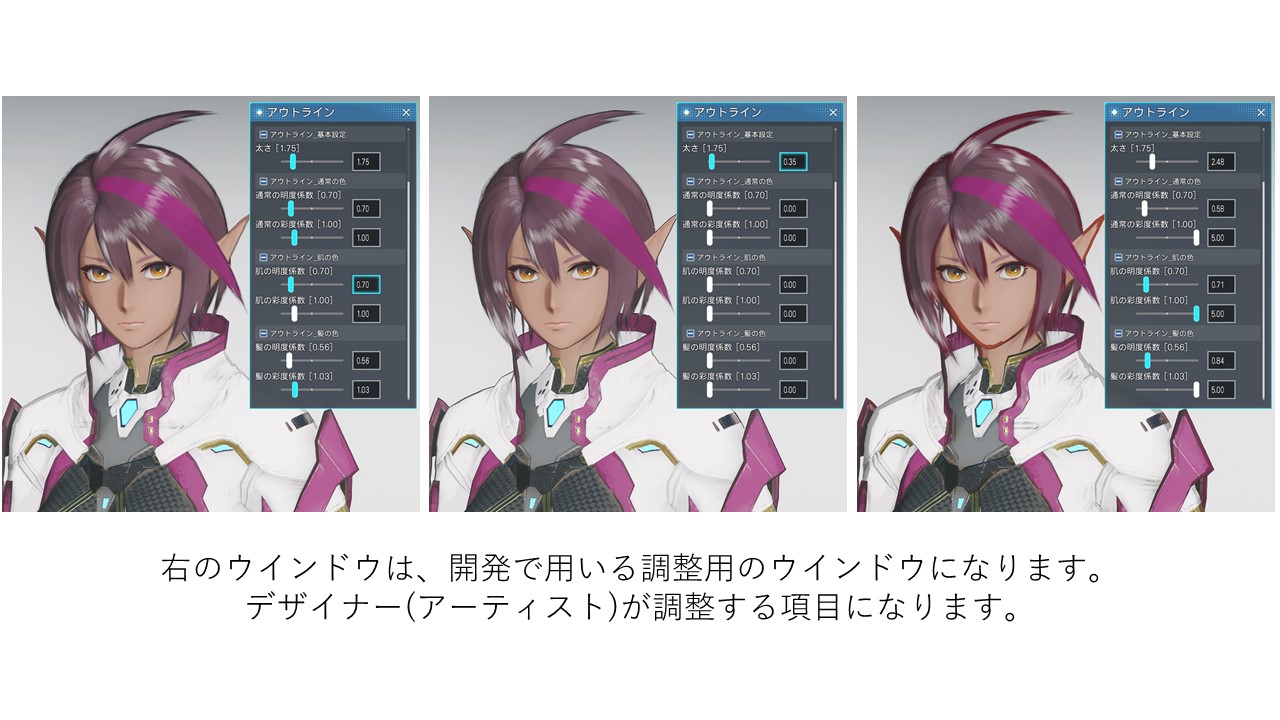 パラメータとしては、アウトラインの太さや色を調整できるようにしました。 特にアウトラインの色については、近傍の色を元に明度と彩度の調整をすることで色トレスができるようにしています。 また、これらのパラメータは「肌」、「毛髪」、「その他」で調整ができるように実装しています。