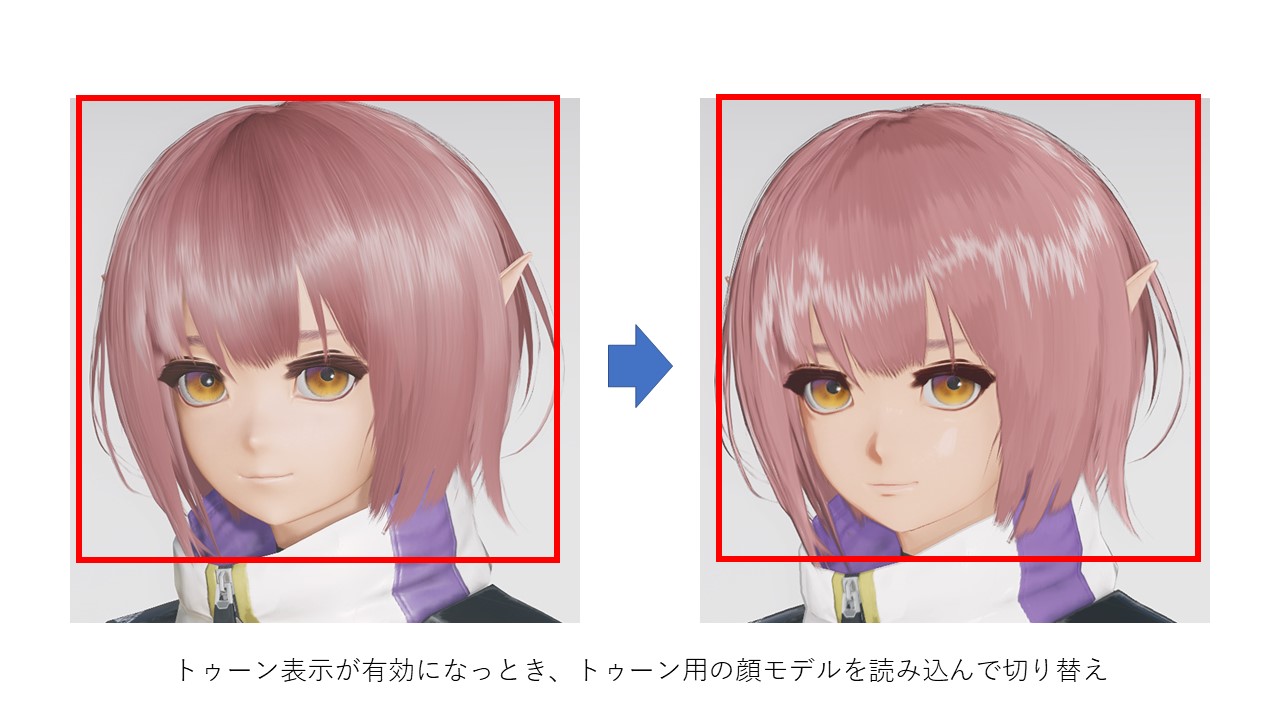 これに対処するには、顔モデルの法線を調整する等、データに対して調整を行う必要があります。 『NGS』では、トゥーン表示用に法線等を調整したモデルを新たに用意し、トゥーン表示に切り替えた際に顔モデルを切り替えることで対処するようにしました。3
