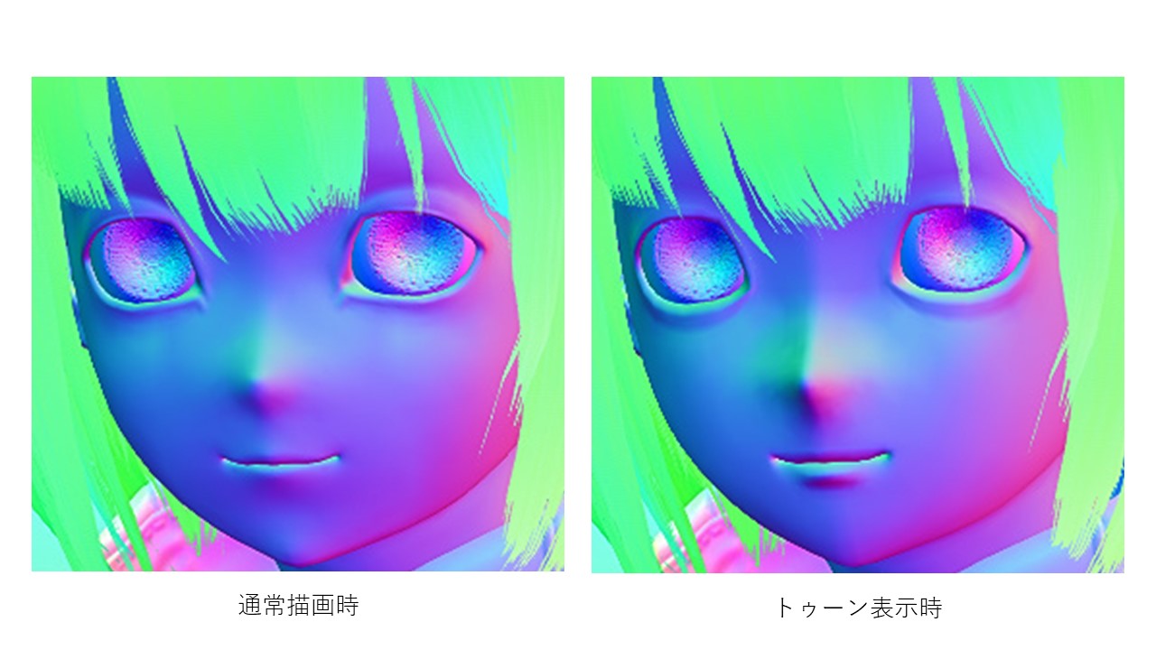 しかし陰影を段階的にする都合上、人間の顔など複雑な凹凸がある物体では陰影が綺麗にならないことが多いです。 このため、トゥーンレンダリングでは物体の法線を調整して陰影を綺麗にし、アニメのような表現に近づけるといった工夫がされています。