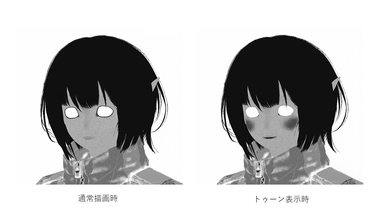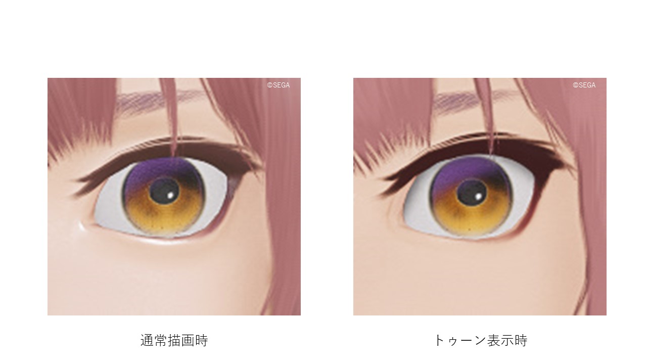 イラストの表現では、目に対してまぶたの影をつけることで立体感を表現することがあります。 『NGS』のトゥーン表示でも同様に目に影をつけることでイラスト特有の立体感のある目を表現しています。