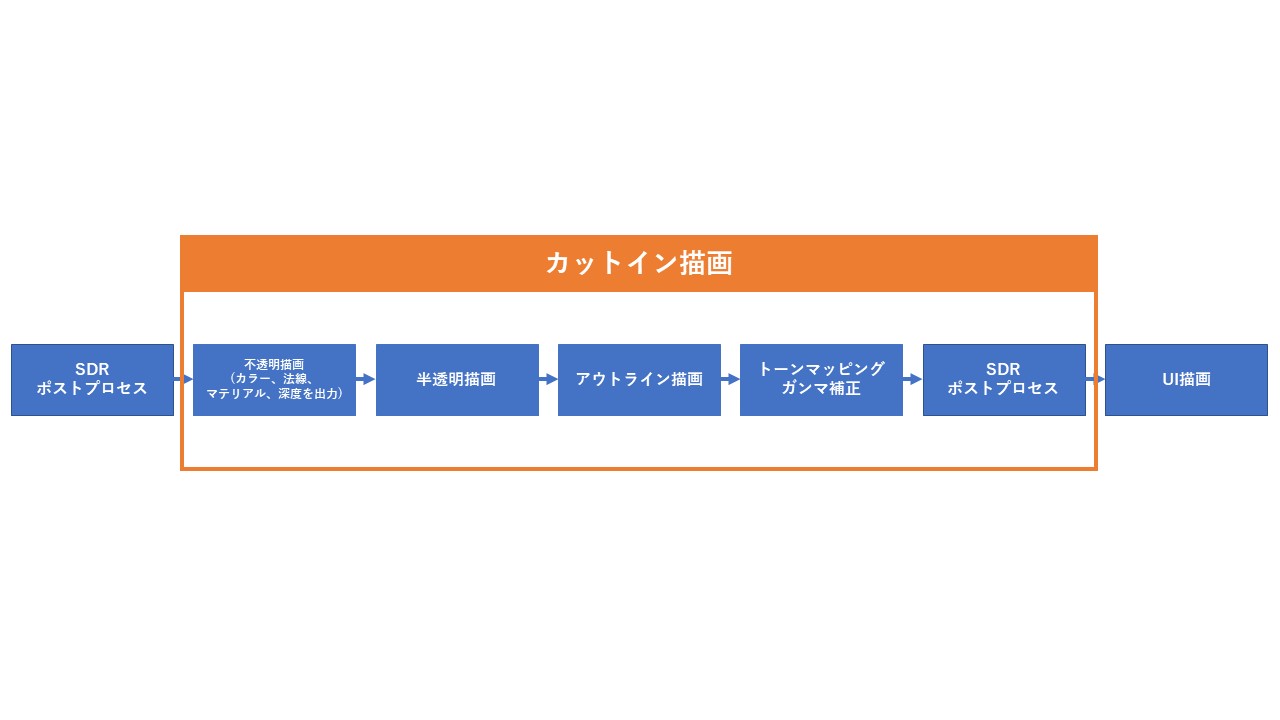 後は、前述した処理と同様に「陰影のマルチトーン化」や「アウトラインの表示」を行っています。 下記がトゥーン表示時における、カットイン描画のパスになります。
