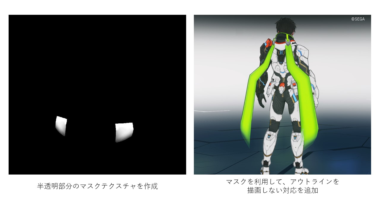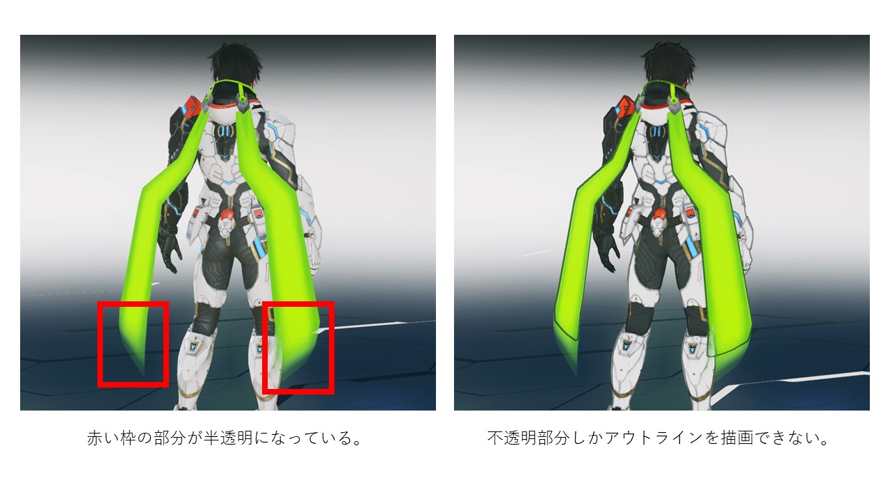 この問題に対処するため、新しく半透明部分を表すアルファマスク作成し、半透明部分にアウトラインが描画されない対応を行いました。 下図が対応後の結果になります。
